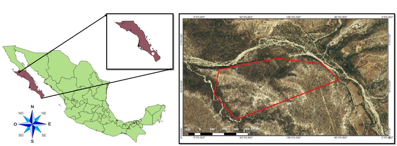 La investigación se llevó a cabo en el área conocida como Rancho Palmar de Abajo, ubicado en la localidad La Matanza, municipio La Paz, Baja California Sur, entre los 23°38 ́02 ́ ́N y 110°17 ́05 ́ ́O (Figura 1). El clima es seco-desértico, con temperatura promedio de 21.2 °C y de 9 °C en invierno; la estación de lluvias comprende los meses de julio a septiembre, pero las precipitaciones pueden ocurrir en invierno (Ramírez et al., 2011). La época seca se verifica de febrero a junio (Troyo et al., 2014).