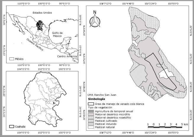 El estudio se realizó en un área de 1 030 ha destinada al venado cola blanca, dentro de la Unidad de Manejo para la Conservación de la Vida Silvestre (UMA) Rancho San Juan (clave DGVS-CR-EX-3133-COA), en el municipio Monclova, Coahuila (Figura 1), ubicada a 38 km en línea recta al este de la cabecera municipal y a 43 km al oeste del municipio Candela, entre los 26°49’31.11’’ N y los 101°01’57.77’’ O.