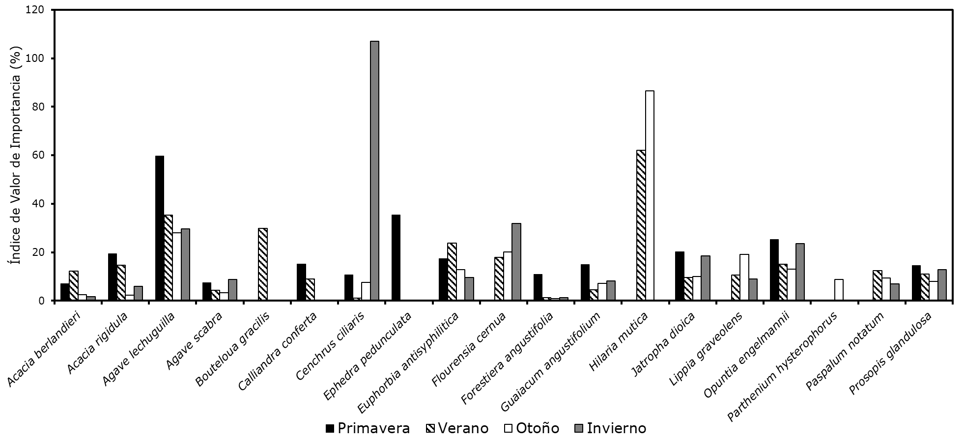 Figura 2. Especies dominantes en relación al Índice de Valor de Importancia por estación del año, en la UMA Rancho San Juan, Monclova, Coahuila, México.