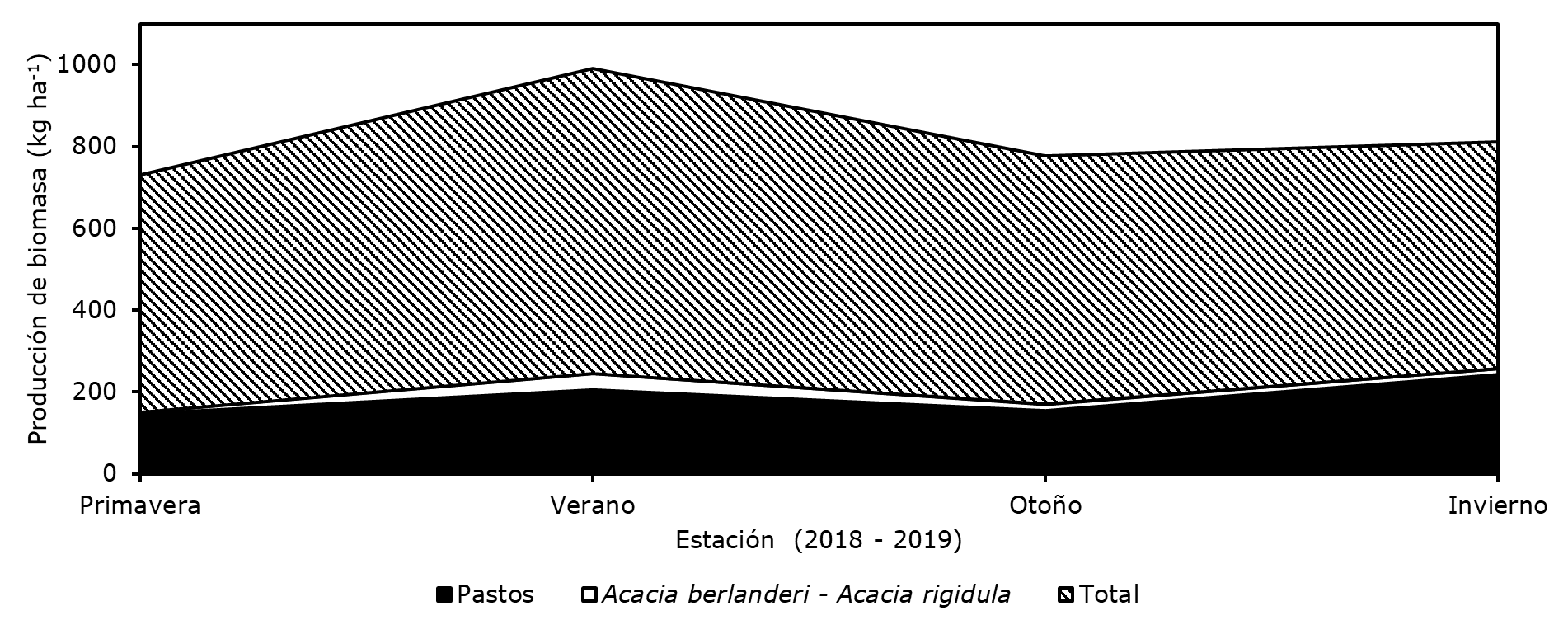 Figura 4. Comparación de la producción estacional de biomasa de especies básicas en la dieta del venado cola blanca en el noreste de México (Acacia berlandieri Benth. y Acacia rigidula Benth.) y pastos, en relación a la productividad total de biomasa, en la UMA Rancho San Juan, Monclova, Coahuila, México.