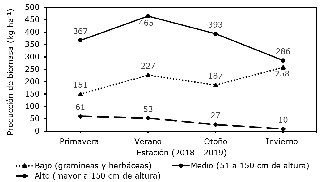 The seasonal variations in biomass production in this study coincide with the variations in seasonal forage consumption by South Texas deer. A decrease in forage consumption is observed in summer, followed by an increase in autumn and the greatest decrease in winter (Wheaton and Brown, 1983). The middle stratum contributed the highest amount of biomass in the four seasons of the year (> 1 000 kg ha-1), being summer, the season that contributed the highest biomass (1 858.52 kg ha-1) (Figure 3). This was mainly due to the 80 mm of precipitation in the area in July. However, it was estimated that grasses and herbaceous plants produced a greater quantity in winter (1 032.70 kg ha-1). The upper stratum was the one with the lowest biomass (≤ 250 kg ha-1) (Figure 3).