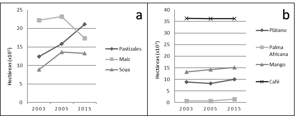El reemplazo de las áreas de cultivos agrícolas con plantaciones fue otro de los cambios observados; en este sentido, las estadísticas de producción agropecuaria del SIAP (2020) confirman el patrón de cambio de uso del suelo observado en los mapas. Los datos de la producción agrícola muestran una disminución en la superficie del maíz (Figura 4), que pasó de 22 223 ha en el año 2003 a 18 048 ha en 2014, una tendencia similar se observa en la producción de la soya; en tanto que los pastizales tuvieron un fuerte crecimiento, al pasar de 12 378 ha a 18 149 ha; los cultivos perennes en general presentaron un ligero incremento en sus extensiones, excepto el café y el cacao (SIAP, 2020).