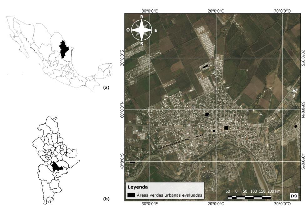 Figura 1. a) Estado de Nuevo León, b) Municipio Montemorelos, c) Áreas verdes urbanas evaluadas en la ciudad de Montemorelos.
