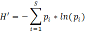 H’ = Índice de Shannon-Weiner S = Número de especies presentes N = Número total de individuos ni = Número de individuos de la especie ln = Logaritmo natural | |