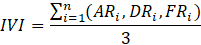 ARi = Abundancia relativa por especie respecto a la densidad total DRi = Dominancia relativa de la especie i respecto a la dominancia total FRi = Frecuencia relativa de la especie i respecto a la frecuencia total | |
