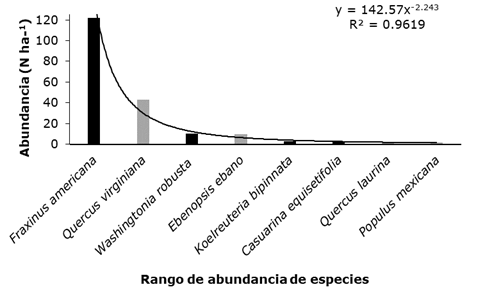 La curva rango de especies/abundancia indica una dominancia de F. americana (Figura 4). Lo anterior puede deberse a la preferencia por ese árbol para uso ornamental en la región noreste del país (Alanís-Flores, 2005; Alanís et al., 2014; Leal et al., 2018). Sin embargo, esta dominancia no es recomendada en comunidades establecidas en ambientes urbanos (Santamour, 1990), donde por cuestión de control de plagas se busca tener mayor diversidad de especies.