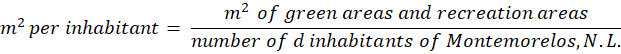 In the present study, the green area per inhabitant (0.87 m2) was lower than that observed by Mejía Salazar and Gómez (2015) for Tepic, Nayarit (1.2 m2) and lower than that calculated by Alanís-Flores (2005) for Monterrey (4.6 m2). All these values, including the one in this study, were lower than the provision of urban green areas suggested by various authors, which represents a deficit in these places, both in Montemorelos municipality as in other cities in Mexico (Palomo, 2003; Wang, 2009; Molinar, 2015).