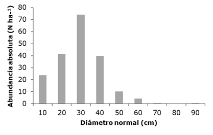 According to the results obtained for density (N ha-1) -Normal diameter (cm), it can be observed that the distribution is normal, with a high number of mature trees, since most of the individuals (74 N ha-1) are grouped into the 30 cm and 40 cm category (40 N ha-1). These data were different from those of Alanís et al. (2014), who evaluated the green areas of a 30-year-old university campus where they have made constant plantings and have a high number of low diameter class trees and a reduced number of high class trees, which has resulted in a negative exponential trend line in the density of individuals as the diameter increases.