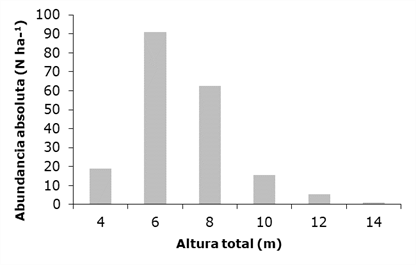 The height class graph shows a scarce presence of short trees (category 2 - 4 m; 19 N ha-1) and the highest in the category 4.01 to 6 m (91 N ha-1). The distribution of individuals in height categories had a positive asymmetric distribution (Figure 3).