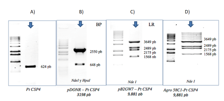 Figura 3. Comprobación del clonaje de PtCSP4 en geles de agarosa con enzimas de restricción. El producto de la clonación está marcado con flechas. Comprobaciones de cada clonaje, A) El fragmento PtCSP4 obtenido (624 pb). B) Reacción LR se clonó en el vector de expresión pDONR-PtCSP4 de 3198 pb con las enzimas de restricción NdeI y HpaI; C) el transgen se quedó bajo el control del promotor 35s en un vector binario PB2GW7-PtCSP4 que generó un fragmento de 9881 pb con ayuda de la enzima de restricción NdeI. D) construcción resultante, se transformaron células de la cepa C58C1 (pMP90) de Agrobacterium, que se utilizó para infiltrar plantas de Arabidopsis.