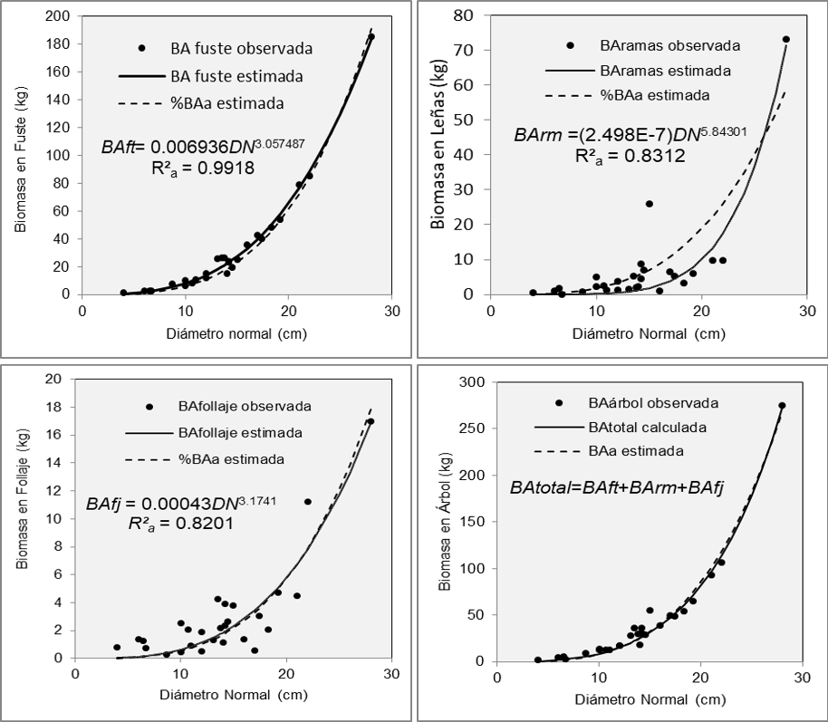 Los modelos alométricos se basan para estimar la biomasa solo en el diámetro normal (Návar et al., 2004; Avendaño et al., 2009); sin embargo, diversos autores recomiendan incluir la altura, ya que se reduce el error estándar, se evitan sobreestimaciones y se mejora el ajuste de los modelos (Figueroa-Navarro et al., 2010; Ruíz et al., 2011; Rodríguez et al., 2012).