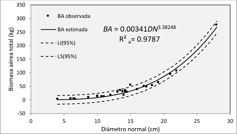 Se probaron modelos lineales y no lineales citados en la literatura especializada para relacionar la biomasa aérea (BA) con las variables diámetro normal (DN) y altura total (AT) o ambas (DN∙AT; DN2∙AT). De acuerdo al análisis realizado, el mejor ajuste se obtuvo con el modelo potencial expresado en su forma normal como: