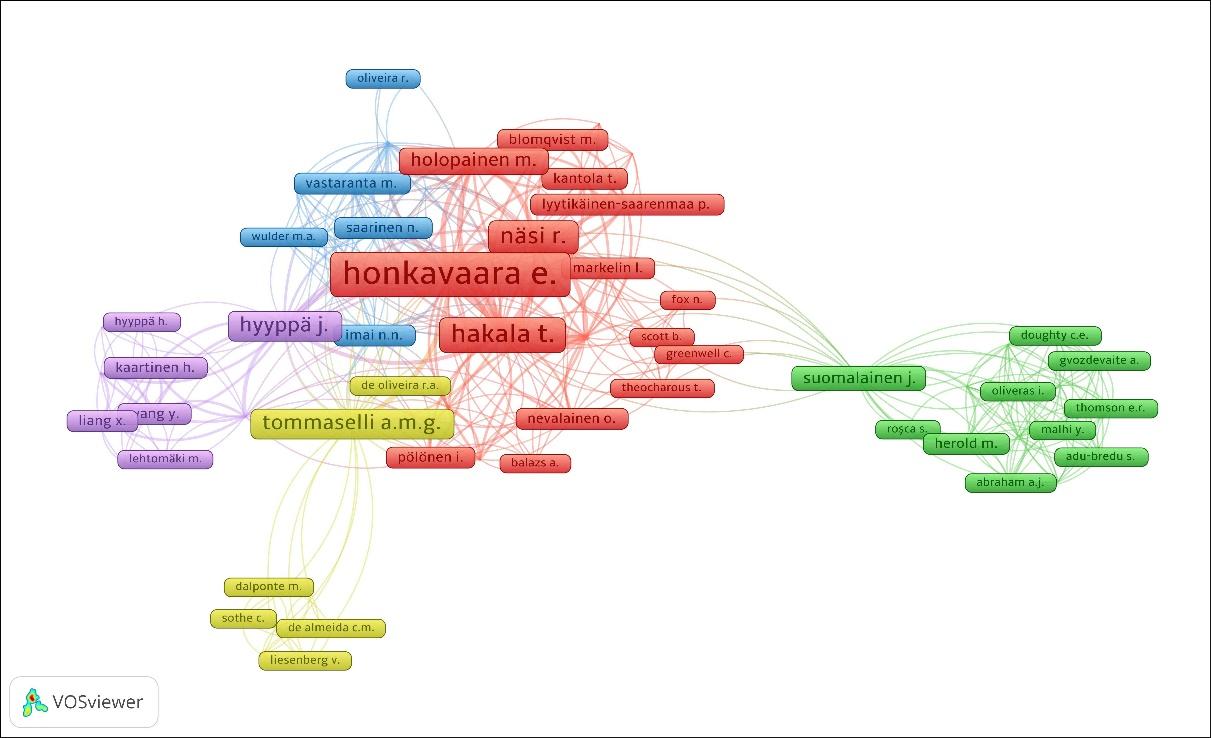 Los autores más notables en productividad científica sobre la utilización de los VANT en el sector forestal fueron: E. Honkavaara, con 10 publicaciones; T. Hakala, con siete; y R. Näsi, con seis. Su tasa de productividad se asoció a los ecosistemas de su área de influencia y a las instituciones de su adscripción. Notablemente, todos ellos provienen de instituciones reconocidas a nivel mundial, localizadas en Finlandia (e.g. Finnish Geospatial Research Institute, Finnish Geospatial Research Institute y National Land Survey of Finland).