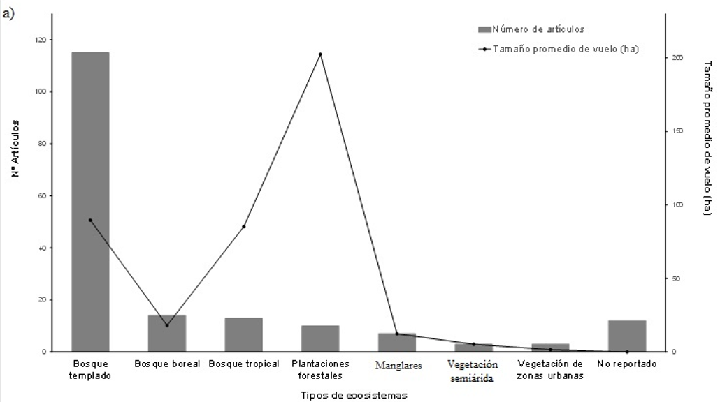 El tamaño del área de vuelo promedio en los artículos analizados fue de 59.2 ha. Los bosques con mayor cobertura de vuelo promedio fueron las plantaciones forestales, con 202.4 ha; mientras que, en los bosques templados cubrieron en promedio 89.6 ha (Figura 5a).