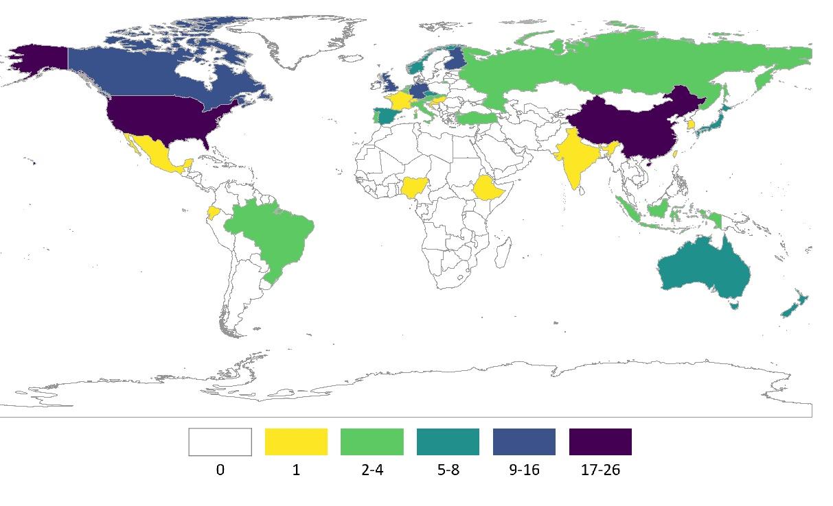 En la publicación de los artículos participaron autores de 34 países, de los cuales China y Estados Unidos de América reúnen el mayor número de publicaciones: 26 y 21 artículos, respectivamente. También, destacan Finlandia, Alemania, Reino Unido y Canadá, que en conjunto con China y Estados Unidos de América representan 57 % de todos los artículos analizados en el presente estudio (Figura 4).