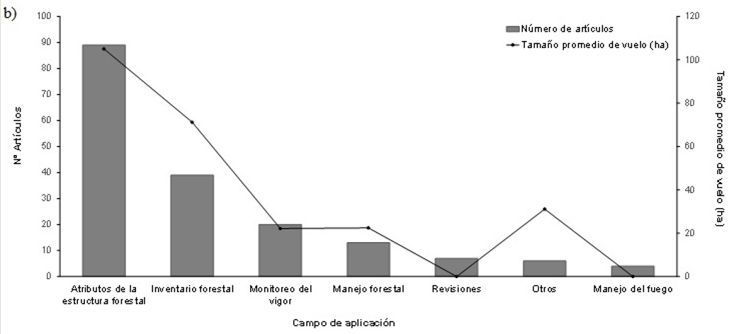 Figura 5. Número de artículos publicados sobre estudios forestales que utilizaron VANT y tamaño promedio de vuelo (a) por tipo de ecosistemas y (b) por campo de aplicación.