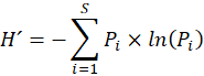 Shannon-Weiner (H’) | Donde: S = Número de especies Pi = Proporción de individuos de la especie i | |