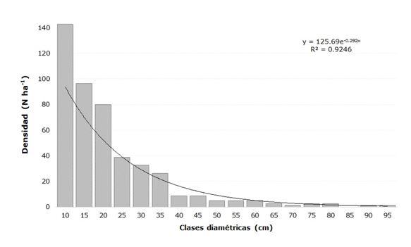 La distribución diamétrica del bosque presentó una tendencia exponencial negativa en forma de curva de Liocourt o “J invertida” (Figura 2), que revela una comunidad en proceso de regeneración, con un desarrollo hacia etapas de crecimiento mayores. Se registró una alta cantidad de individuos jóvenes que sustituirán a la comunidad vegetal madura, constituida por árboles, probablemente, en fase longeva pertenecientes a las clases diamétricas superiores (Arruda et al., 2011; Hernández-Stefanoni et al., 2011).