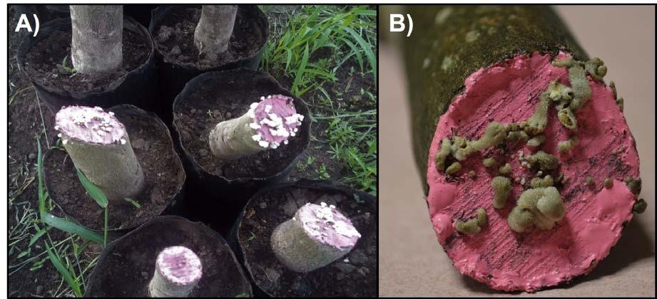 A) Tocones enfermos; B) Cuerpos fructíferos en el tejido.