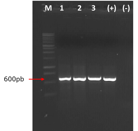 Figura 3. Amplificación del producto PCR de Schizophyllum commune Fr. asociado a la pudrición de tocones de Hevea brasiliensis (Willd. ex A. Juss.) Müll. Arg.