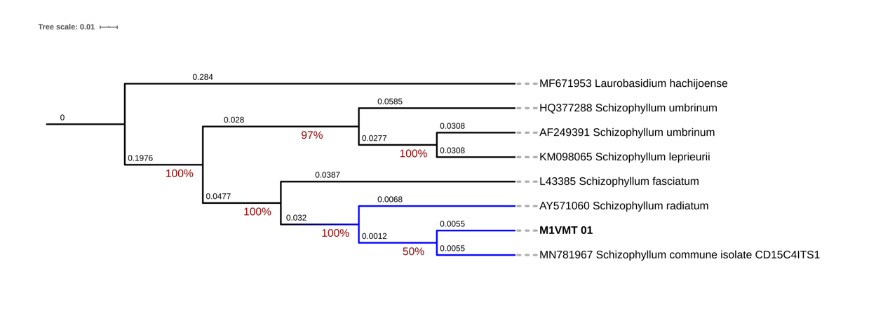The phylogenetic tree of Schizophyllum commune was generated from 2 000 000 generations. Phylogenetic reconstruction showed that the MZVMT_01 isolate clustered in the same clade with the S. commune sequence MN781967 (Figure 4), which corresponds to a strain in a study of wood decay fungi in Northwest Arkansas forests (Alshammari and Stephenson, 2018).
