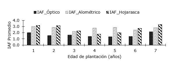 Índice de área foliar. Los valores estimados de IAF promedio que incluyeron las siete plantaciones fueron 2.7, 2.6 y 1.6 m2 m-2, dentro de los intervalos 1.8 a 3.7, 1.3 a 4.2 y 1.0 a 2.6 m2 m-2, para IAFAlométrico, IAFHojarasca e IAFÓptico, respectivamente. El método alométrico estimó el valor mayor de IAF en la plantación de un año y el menor se registró para la edad de tres años (Figura 4). El valor más alto del IAFHojarasca se registró en la plantación de siete años y el más bajo en la de cuatro años. El valor del IAFÓptico fue superior en las plantaciones de siete y uno años de edad y el resto presentaron valores homogéneos inferiores a 1.7 m2 m-2.