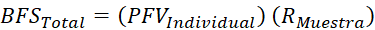 Estimación del área foliar proyectada. El AFPIndividual (m2) por árbol se estimó como el producto del AFEIndividual y la biomasa foliar seca (BFSTotal) (kg) (Ecuación 2). La BFSTotal se calculó siguiendo la metodología recomendada por Muñoz et al. (2008), la cual resulta de multiplicar el peso foliar verde (PFVindividual) por el cociente (RMuestra) peso seco/peso verde de hojas de la muestra de follaje por árbol derribado (Ecuación 3).