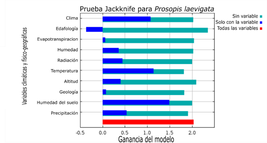 Las variables más trascendentes en la prueba Jackknife fueron la humedad en suelo, la temperatura y el tipo de clima; ya que son las que individualmente tienen la mayor ganancia en el modelo. Esto es atribuible a que la especie es propia de zonas áridas y semiáridas, por lo que sus mecanismos fisiológicos de absorción y conservación de agua son afectados en condiciones ambientales diferentes a las prevalecientes en las regiones de las que proceden (Villanueva et al., 2004).