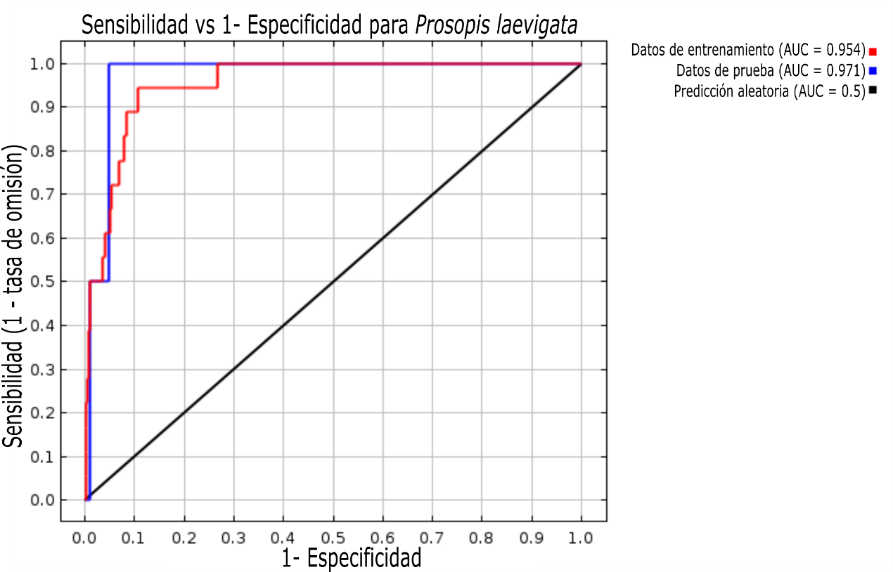 La elección del mejor modelo se realizó de acuerdo con su validación, ya que se buscó que las curvas de entrenamiento y de datos del análisis ROC describieran un ajuste similar y cercano entre sí. Ello implica que el ajuste del modelo es óptimo y señala la ausencia de errores de omisión (Figura 3); puesto que, entre más cerca se ubiquen las líneas de entrenamiento y prueba, el modelo describe mejor la realidad (de Pando y Peñas, 2007).