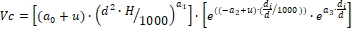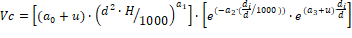 H = Total height (m); Vc = Commercial volume; a0, a1, a2 and a3 = Parameters to be estimated; +u = Random effect; e = Exponential function.