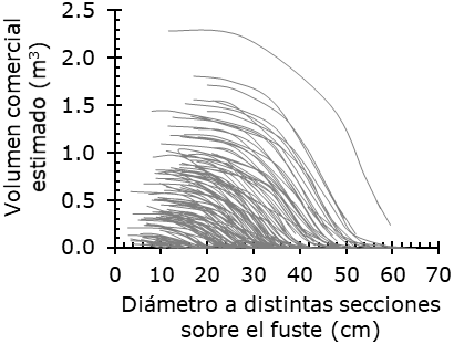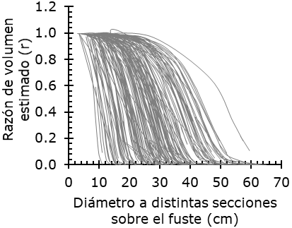 In recent years in Mexico, modeling has been carried out through functions that consider diameters at different heights on the stem and compatible commercial taper-volume systems for different species of the Pinus genus (Tapia and Návar, 2011; Quiñonez-Barraza et al., 2014; Tamarit et al., 2016; Silva et al., 2018), or by volume ratio models for species such as Eucalyptus urophylla Blake in Huimanguillo, Tabasco, Swietenia macrophylla King in Quintana Roo and Pinus pseudostrobus Lindl. in San Juan Nuevo Michoacán, among others (Hernández-Ramos et al., 2018a; García-Espinoza et al. 2018).
