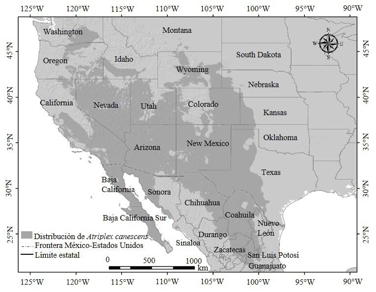 Figure 1. Distribution area of Atriplex canescens (Pursh) Nutt. in Mexico and the United States of America.