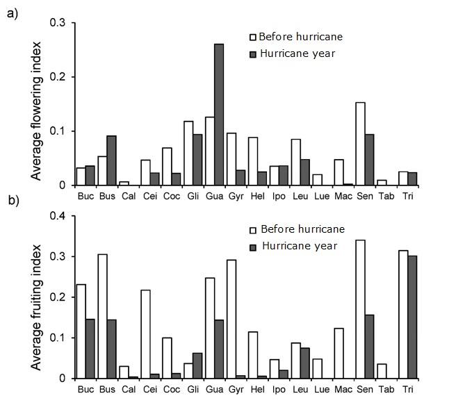 Figure 4. Monthly average flowering (a) and fruiting (b) phenology recorded in a tropical dry forest for three years pre- and a year post-hurricane Karl. Species acronyms are in Table 1.