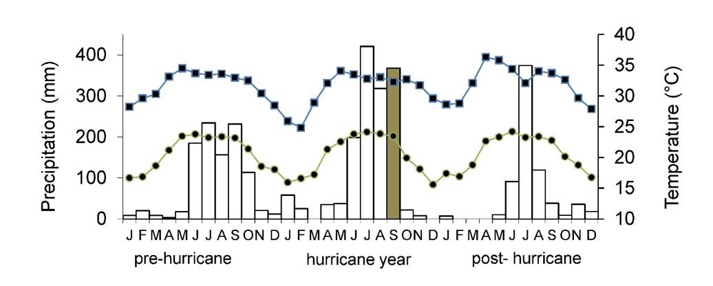 Figure 1. Monthly precipitation (bars) and maximum (blue line and squares) and minimum (green line and circles) temperature for pre-hurricane (average of 3 years), hurricane year (2010) and post hurricane year. Data from the nearest meteorological station located at 7 km from the study site.