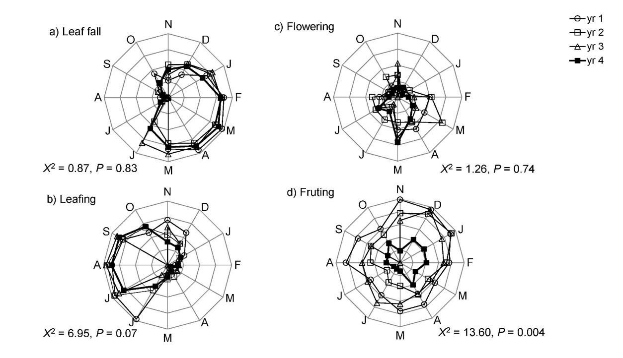 Figure 3. Phenological activity recorded at community level during three years before the hurricane (yr1 = Nov 2007- Oct 2008; yr 2= Nov 2008-Oct 2009, yr 3= Nov 2009- Sep 2010); year 4 starts in November 2010 just after the hurricane stroke central Veracruz, Mexico. a) Leaf fall, b) leaf production, c) flowering, and d) fruiting.