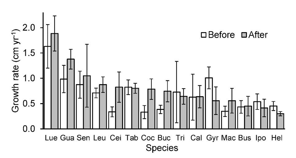 Overall, there were significant differences between pre- (0.68 + 0.09 cm yr-1) and post-hurricane (0.79 + 0.10 cm yr-1) growth rate (Χ2 = 5.12, P = 0.024) and among species (Χ2 = 66.36, P < 0.0001, Figure 2). However, the interaction between species and hurricane effect was not significant (Χ2 = 17.16, P = 0.25). The studied species diameter growth rates before and after the hurricane varied from 0.33 to 1.63 cm yr-1 and 0.30 to 1.89 cm yr-1, respectively (Figure 2). The species with the highest diametric growth was Luehea candida (DC.) Mart., followed by Guazuma ulmifolia Lam. and Senna atomaria.