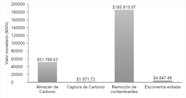 Para estimar el precio del almacén y captura de C se consideró un precio $10 USD por tonelada de CO2e, valor promedio estimado en el mercado informal de carbono en México (USDA, 2018). En la valoración de la escorrentía evitada y la remoción de contaminantes, se consideraron los precios empleados en los Estados Unidos de América estandarizados a México que se proponen en i-Tree Eco v6: 2.14 USD por m3 de escorrentía evitada, $1 532.80 por Mg de CO, $24 961.90 por Mg de O3, 1 358.4 USD por Mg de SO2, $3 728.40 por Mg de NO2 y $866.00, 474.7 USD por Mg de PM2.5.