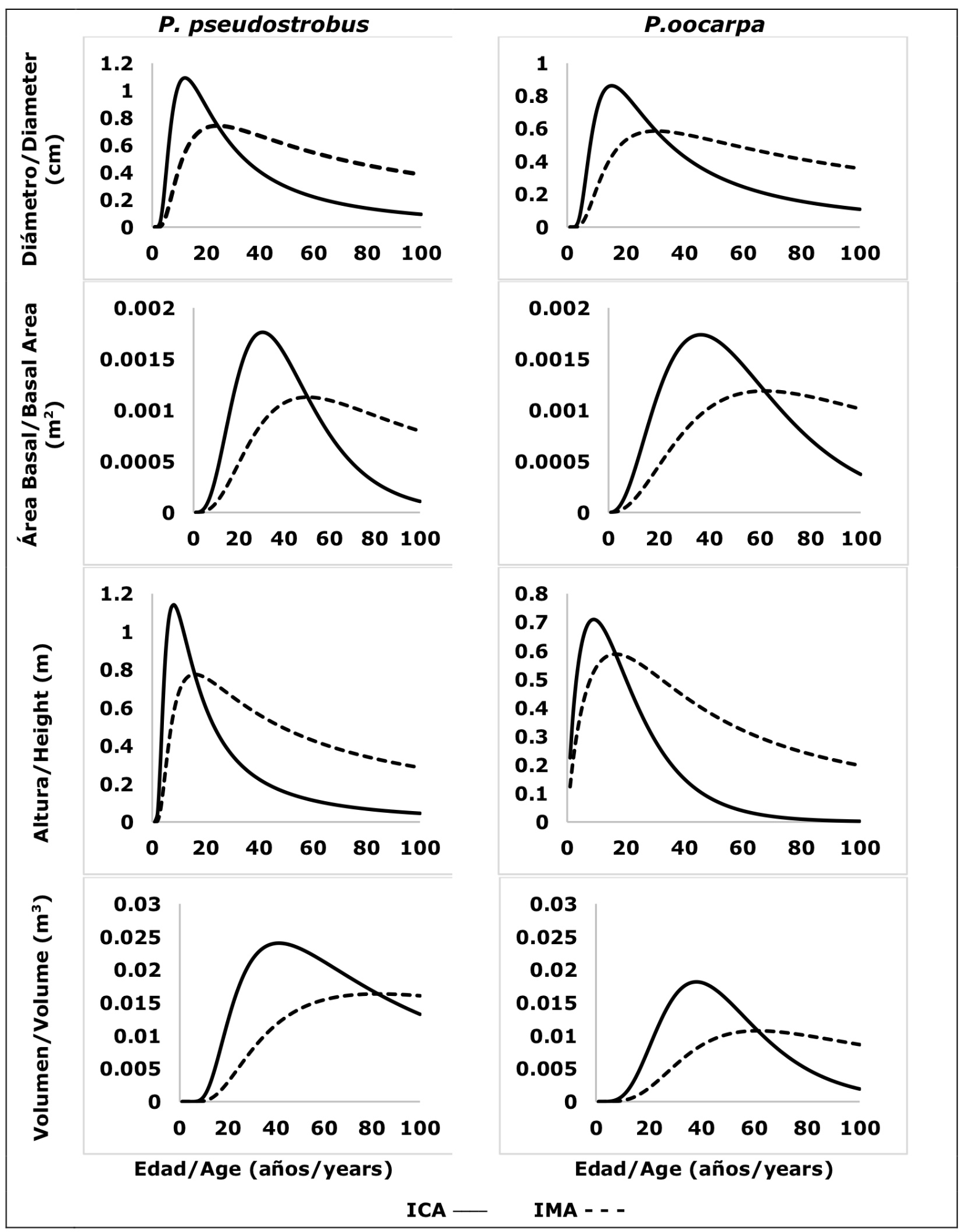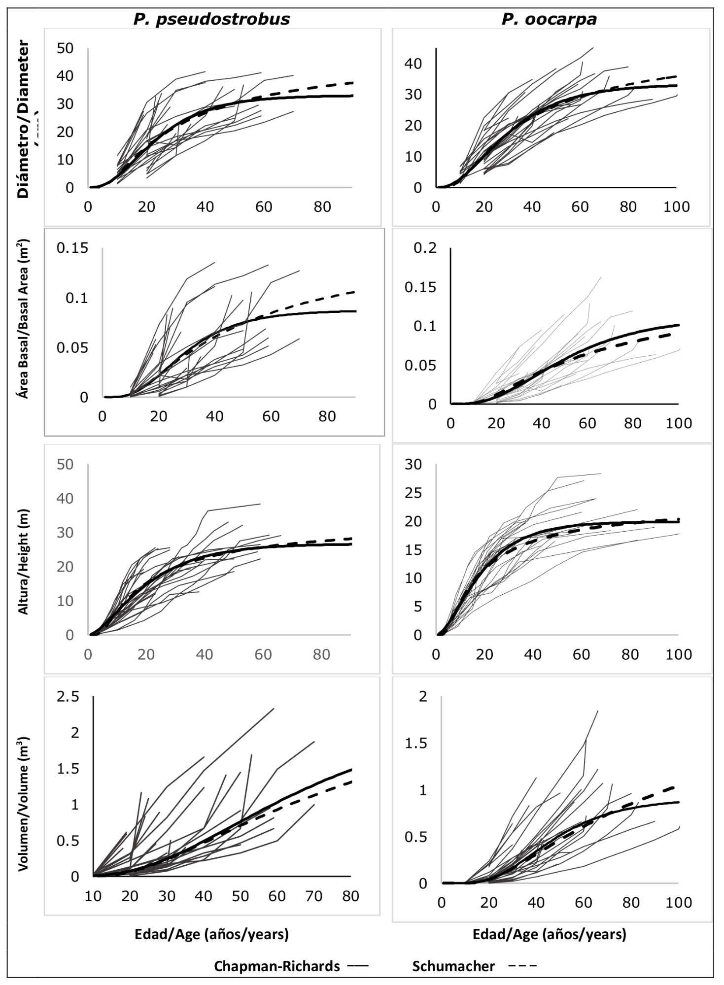 Sin embargo, al considerar el nivel de significancia de los estimadores de los parámetros (<0.05), se desestimó el modelo de Weibull para predecir el crecimiento en diámetro, área basal, altura y volumen en Pinus pseudostrobus, y del crecimiento en área basal y volumen para Pinus oocarpa. De manera similar, los modelos de crecimiento en volumen de Chapman-Richards y Hossfeld I mostraron parámetros no significativos en Pinus pseudostrobus. Para esta especie, solo el modelo de Schumacher registró estimadores de los parámetros significativos en las cuatro variables de crecimiento estudiadas. En relación con Pinus oocarpa, todos los estimadores de los modelos de Chapman-Richard, Hossfeld I y Schumacher fueron significativos (Pr<0.0001) en las cuatro variables estudiadas. Con base en el contexto anterior, la valoración gráfica en la estimación del crecimiento de cada variable por especie, realizada con los modelos cuyos parámetros fueron todos significativos permitió definir al mejor modelo.