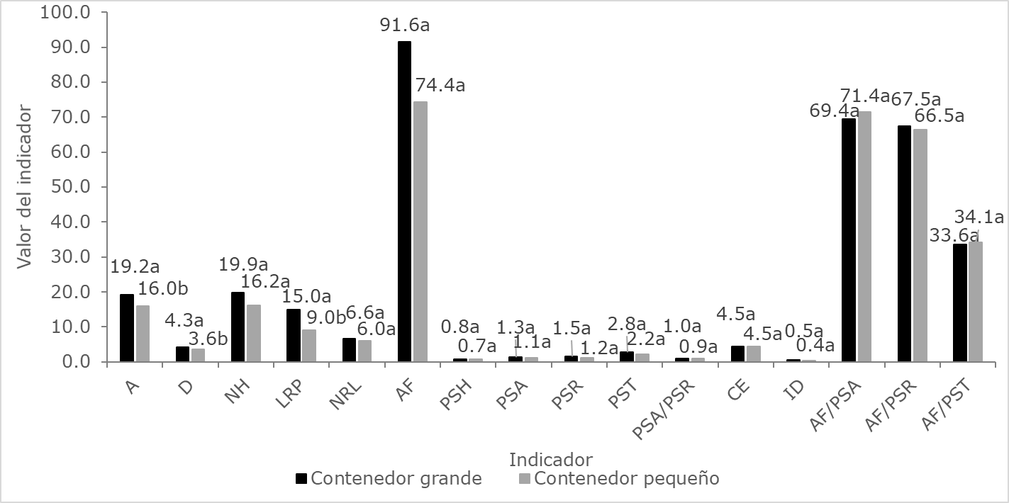 Los contenedores grandes produjeron planta con mayor altura que los pequeños (19.2 vs 16.0 cm, respectivamente; P = 0.0344); diámetro (4.3 y 3.6 mm, P = 0.0249); y longitud de raíz principal (15.0 y 9.0 cm, P = 0.0127), pero sin diferencias significativas para el resto de las variables (P > 0.05). Lo anterior indica que la biomasa total, aérea y subterránea, así como las relaciones entre diferentes biomasas fueron proporcionales, independientemente del tamaño del contenedor (Figura 1).