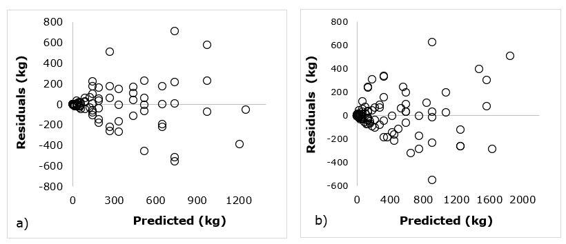 adjR2 = Adjusted coefficient of determination; RMSE = Root mean square error (kg); WT = White’s test; DW = Durbin-Watson test; P>F = Significance of the model; a, b, c = Estimated parameters; SE = Standard error (kg); Pr>T = Probability value of the Student's t-distribution; = Average bias (kg); *Non-significant (p>0.05).