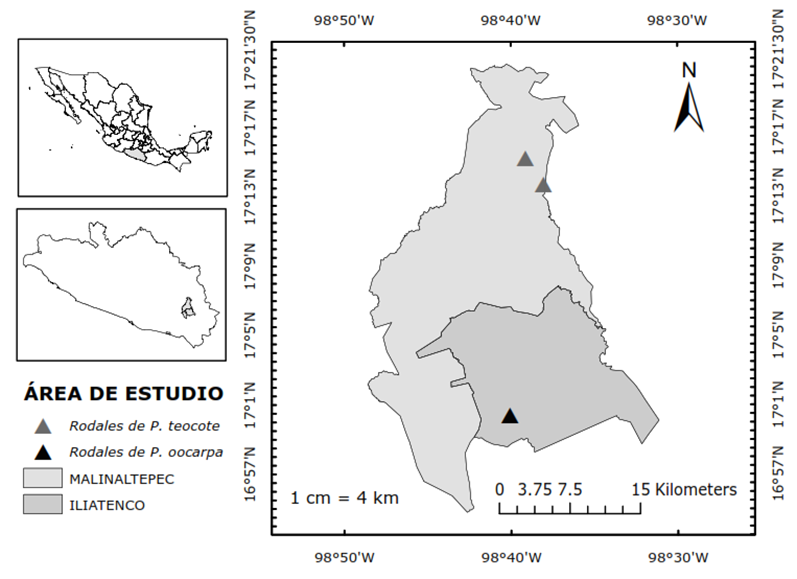 The study area is located between 17°01'45" and 17°15'30" N, and 98°39'24" W (Figure 1), at an altitude of 1 800 to 2 100 m (Figure 2) (INEGI, 2014). It includes Iliatenco and Malinaltepec municipalities in the mountain region of the state of Guerrero, Mexico. The predominant vegetation is pine-oak forests, where P. teocote and P. oocarpa grow naturally in pure stands.