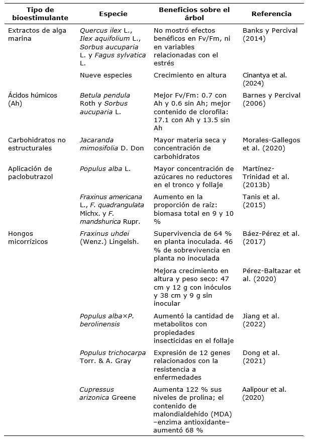 Los bioestimulantes son sustancias que, sin ser nutrientes, pesticidas o mejoradores del suelo, promueven el crecimiento de las plantas cuando se aplican en pequeñas cantidades. Se agrupan en cuatro categorías: ácidos, microorganismos, compuestos bioactivos de origen vegetal y otros. Su aplicación en arbolado urbano busca mejorar la vitalidad y resistencia ante condiciones de estrés. Entre los bioestimulantes empleados destacan extractos de algas marinas, ácidos húmicos, carbohidratos no estructurales, paclobutrazol y microorganismos benéficos. Estos han mostrado eficacia frente al estrés por sequía, salinidad o hídrico, además de fortalecer el sistema inmunitario de los árboles. Productos comerciales a base de ácidos húmicos han mejorado la supervivencia, el vigor de raíces y brotes, y la vitalidad general, evidenciado por resultados en el aumento en la fluorescencia de clorofila. Por otro lado, la aplicación de almidón y glucosa eleva los niveles de almidón en el tronco, lo cual es deseable ya que su reducción se asocia con la muerte en condiciones de estrés severo. Entre los bioestimulantes, los hongos micorrízicos han sido los más estudiados en el arbolado urbano, ya que proporcionan beneficios consistentes en variables de crecimiento y adaptación, incluso a nivel molecular. Finalmente, aunque gran parte del conocimiento sobre bioestimulantes proviene de la agricultura, su potencial en arboricultura es alto. Este trabajo presenta una revisión sobre su uso en condiciones de campo y ambientes semicontrolados; así como, las limitaciones que enfrenta su aplicación en el manejo del arbolado urbano.