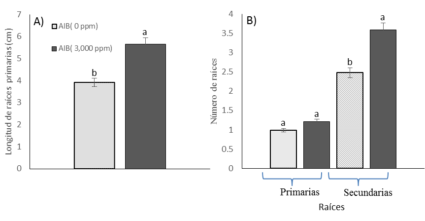 In general, the cuttings maintained a survival rate above 50 %, which is an acceptable percentage for propagation by this technique (Table 3). IBA increased cutting survival by 25 % and also increased the rooting rate by just over 35 %, compared to the controls (Table 3). According to these results, it can be deduced that auxin has a direct influence on root promotion, particularly in those cuttings that probably required stimulation from the external hormonal regulator for their development. The presence of roots in the cuttings allows them to reactivate their physiological functions and form a seedling. Otherwise, unrooted cuttings survive only until the reserves in their tissues are exhausted, and then die. This coincides with what has been pointed out by Fachinello et al. (2005): the survival of the cutting depends not only on its quality (nutritional status, vigor and juvenility) but also on the rapid formation of adventitious roots, which are responsible for providing water and nutrients.