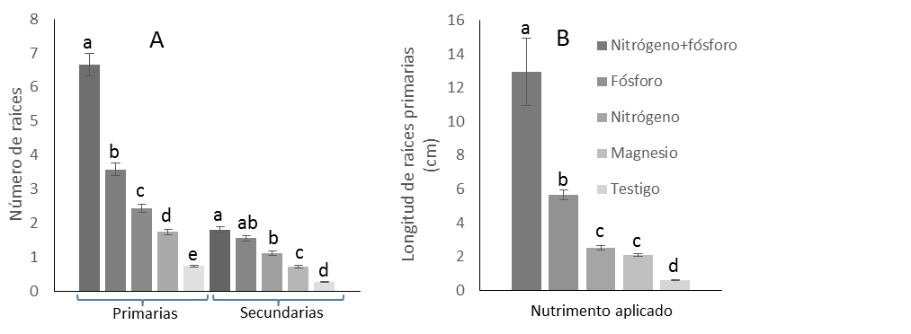 Number of roots = Número de raíces; Longitud de raíces primarias = Length of primary roots; Primarias = Primary; Secundarias = Secondary; Nutrimento aplicado = Applied nutrient; Nitrógeno+Fósforo = Nitrogen+ Phosphorus; Magnesio = Magnesium; Testigo = Control.