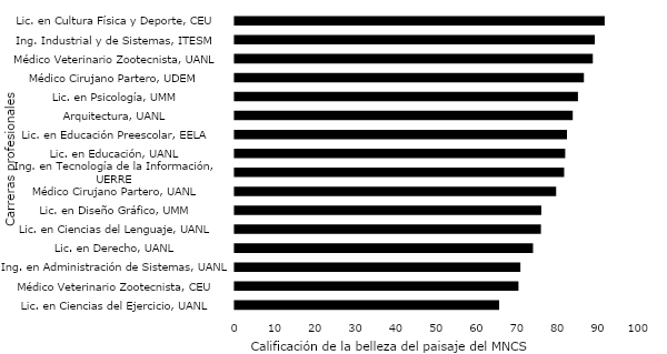 La carrera profesional de los estudiantes en ambos sectores educativos influye en la valoración estética del paisaje del MNCS, de acuerdo a los resultados del ANOVA t(361)=4.11, p<0.05). Destacan las altas calificaciones otorgadas por los de licenciatura en Cultura Física y Deporte, CEU (M=91.82, SE=2.97), Ingeniero Industrial y de Sistemas, ITESM (M=89.35, SE=1.67), así como Médico Veterinario Zootecnista, UANL (M=88.89,SE=1.52); en contraste, las siguientes carreras otorgaron los valores más bajos: licenciatura en Ciencias del Ejercicio, UANL (M=65.52, SE=4.8), e Ingeniero en Administración de Sistemas, UANL (M=70.46,SE=4.86), y Médico Veterinario Zootecnista, CEU (M=70.48,SE=5.10) (Figura 3.).