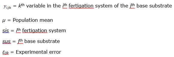 The experimental design was completely randomized with a 22 factorial arrangement in which the fertigation system factor (watering can vs sub-irrigation) and the mixture of substrates (60:30:10 peat:perlite:vermiculite, Vol.:Vol. vs 60:30:10 raw pine sawdust:perlite:vermiculite, Vol.:Vol.).