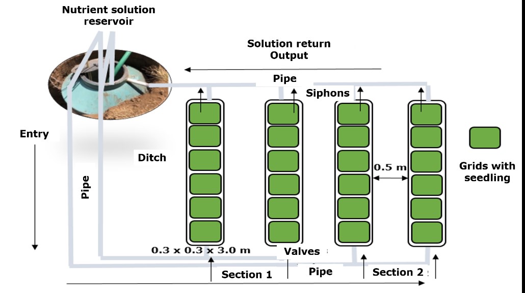 The prototype consisted of a 1 100 L water tank to store the nutrient solution and was placed below ground level. To supply the solution to the four ditches, two submersible pumps with a power of 17 W each were placed inside; ½ inch PVC pipes were used. To control the flow of water, control valves were installed at the outlet end of the PVC pipes. The emptying of the trenches was carried out with siphons located at one end of the trenches. The siphons were connected to a two-inch diameter PVC pipe, which returned the solution to the tank (Figure 1).