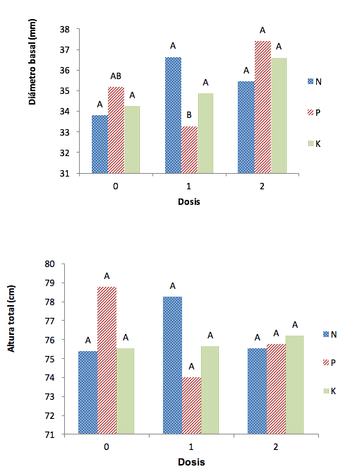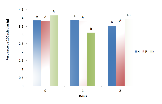 La prueba de Tukey (α=0.05) evidenció que las dosis de N y P no tuvieron un efecto significativo sobre el peso seco de 100 acículas (Figura 2). En cambio, el K generó diferencias entre la dosis cero y uno; de ellas la primera fue mejor, lo cual significa que para el crecimiento de las acículas, la aplicación de potasio tuvo un impacto negativo; es decir, el potasio es un nutrimento suficiente en el sitio de estudio y su aplicación, probablemente, genera un desbalance (exceso) con respecto a los nutrimentos más deficientes (López-López y Alvarado-López, 2010).