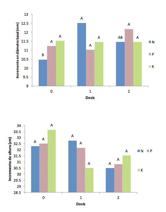 El incremento en altura total no presentó diferencias significativas de los factores probados (nutrimentos), excepto en las interacciones (Cuadro 6). El N con la dosis uno fue el único que superó al nivel cero. La altura de los árboles es muy variable y esta característica pudo ser la razón de la confusión de los efectos de los tratamientos probados. Resultados similares, en cuanto al incremento de altura registraron López-López y Flores-Nieves (2016).