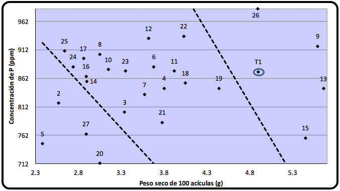 Figura 5. Diagrama de Timmer para el análisis de P en el experimento de fertilización química de Pinus cooperi Blanco en Molinillos, Durango, Dgo.